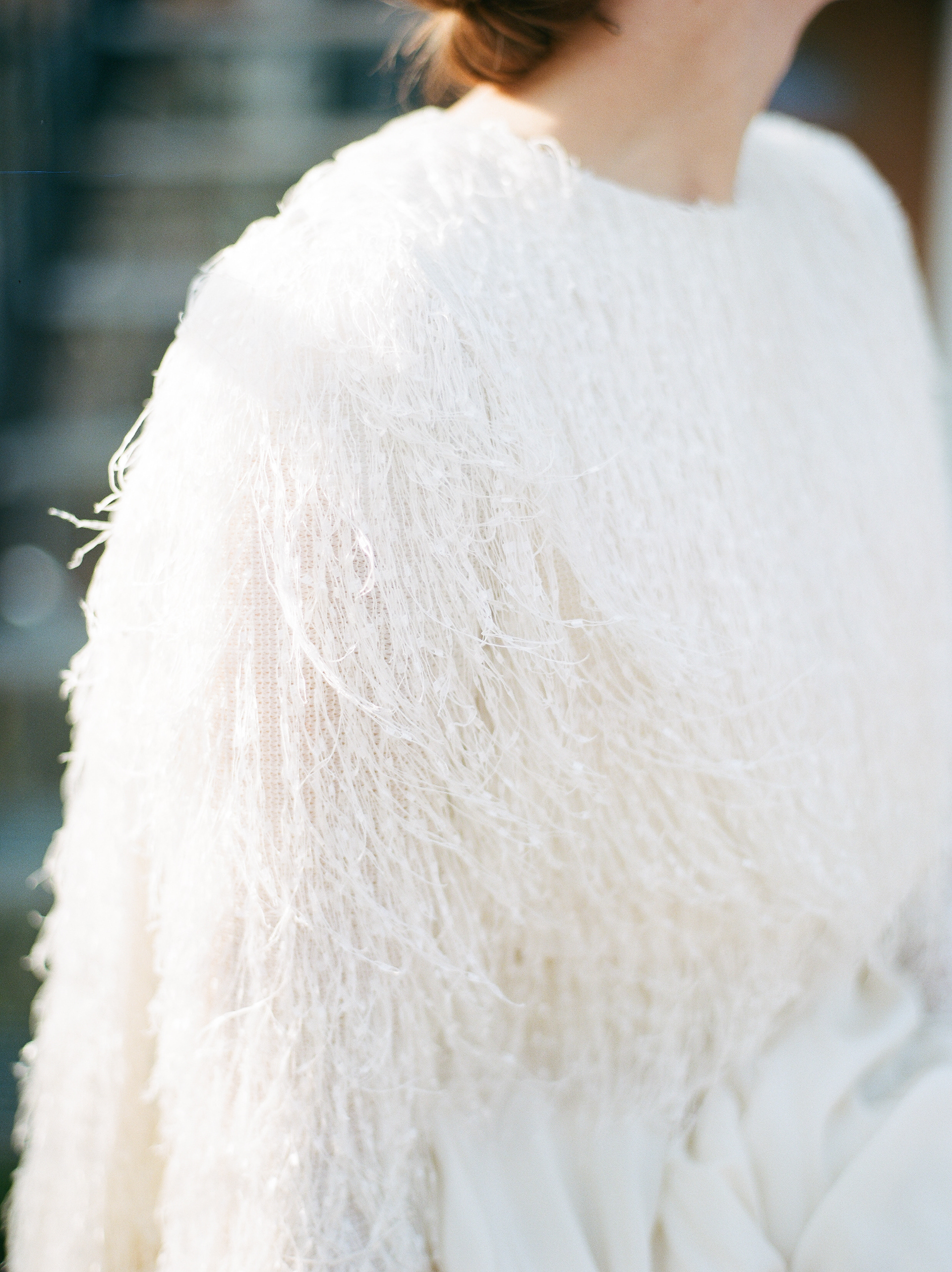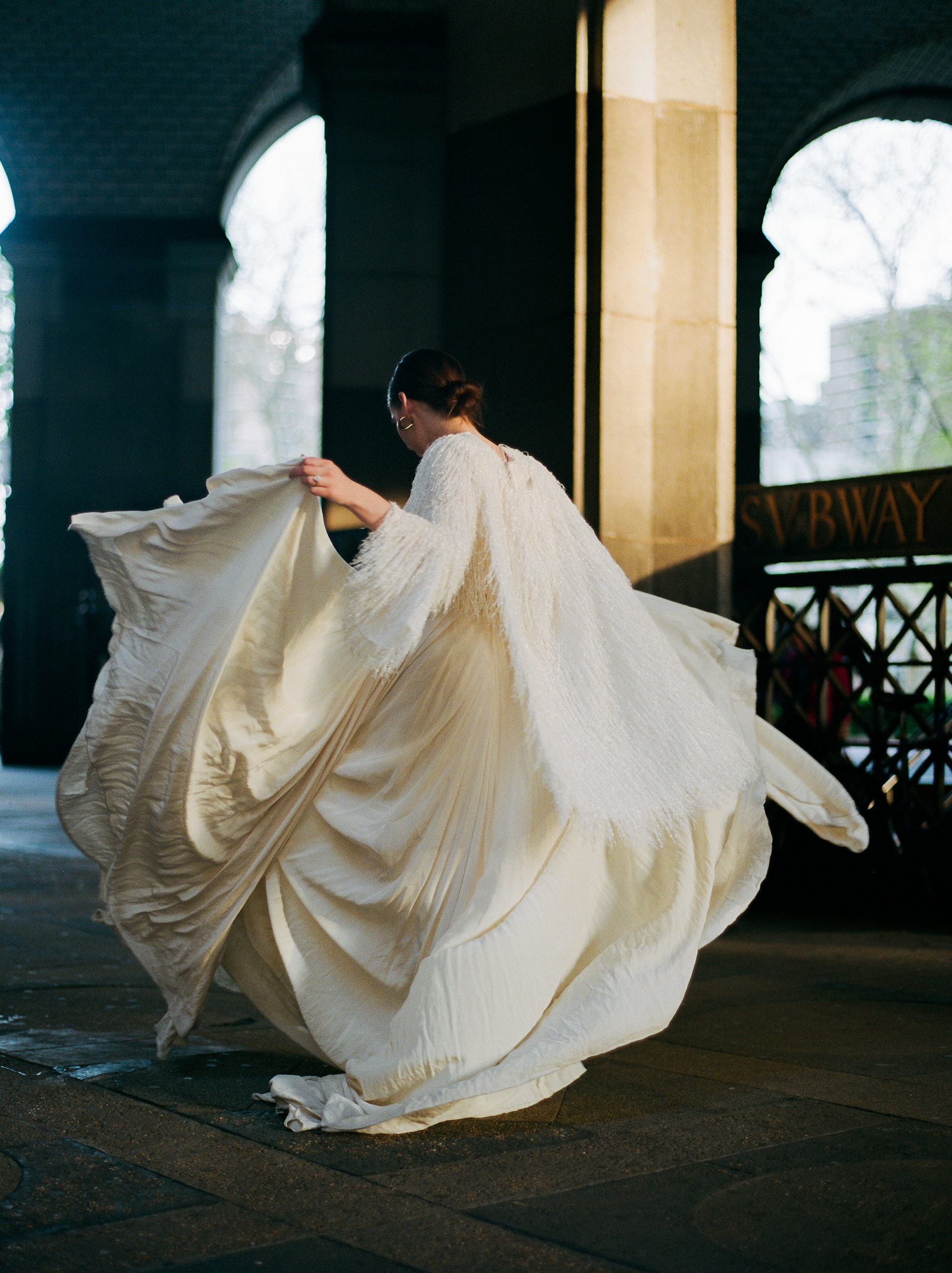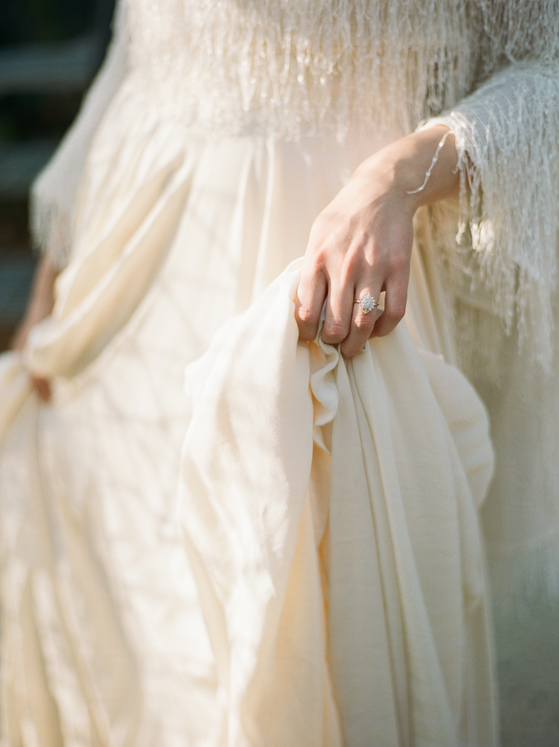 Wedding dress designed by Julie Dumas Rose featuring Parisian fabric and removable cape.