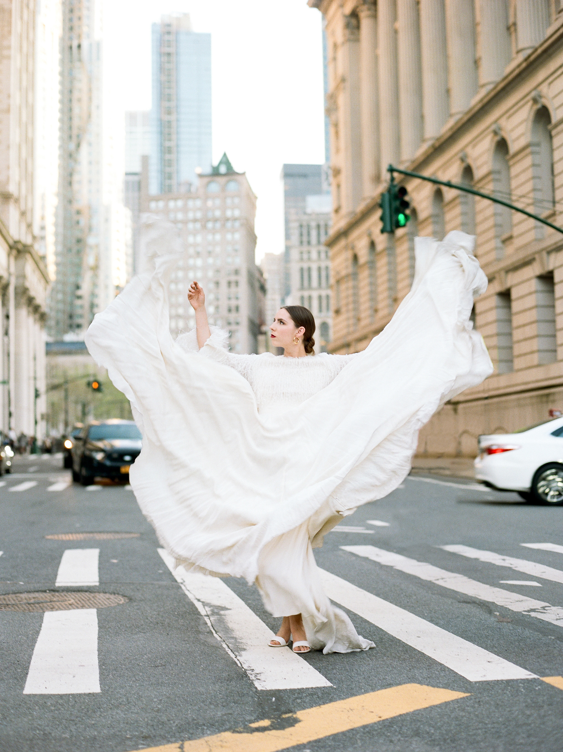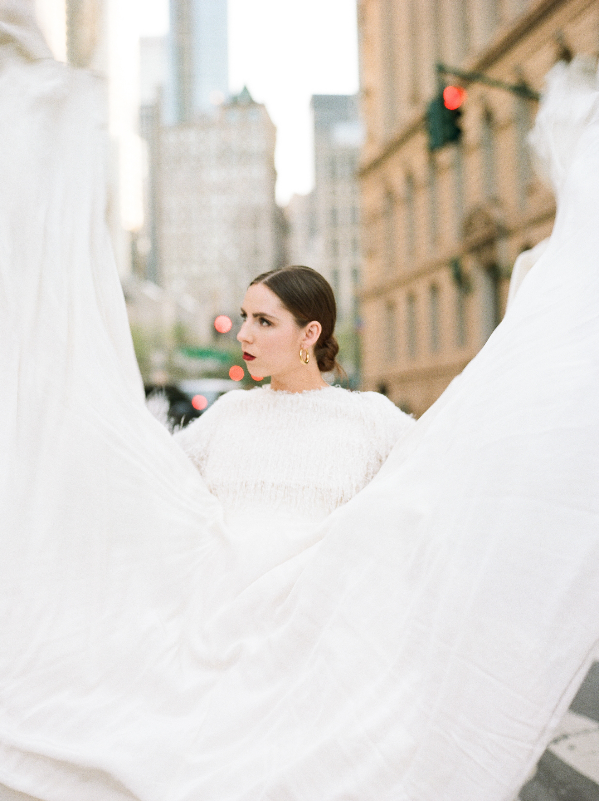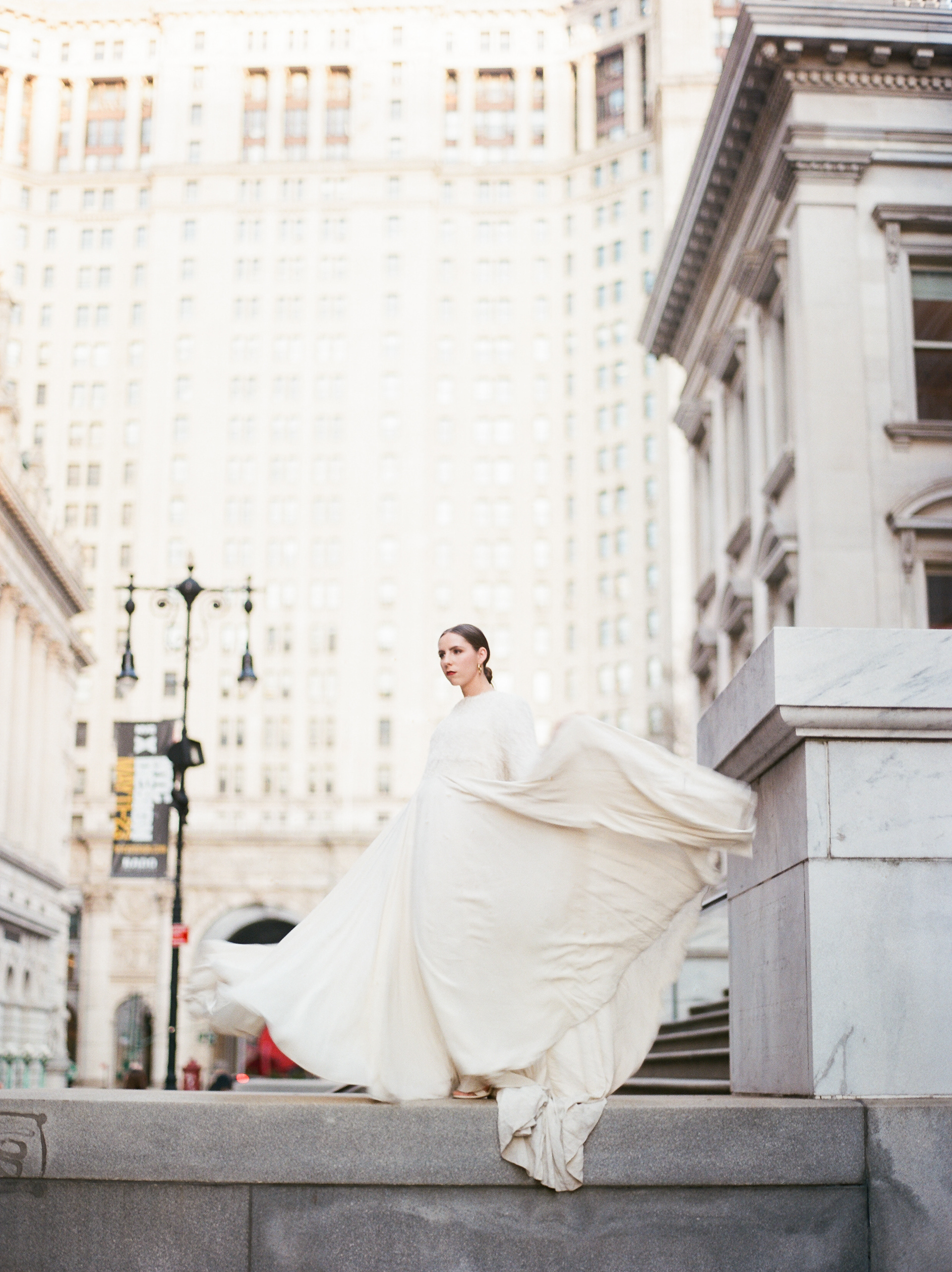 Wedding dress designed by Julie Dumas Rose featuring Parisian fabric and removable cape.